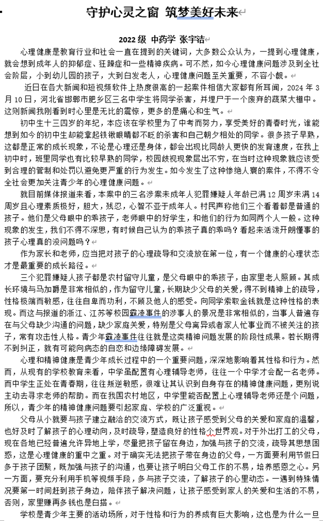 本次征文比赛的圆满结束,不仅为同学们提供了一个展示自我、交流思想的平台,更让同学们深刻认识到了心理健康的重要性,希望同学们能在今后的学习生活中能够持续增强心理优良品质,不断发展心理潜能。
