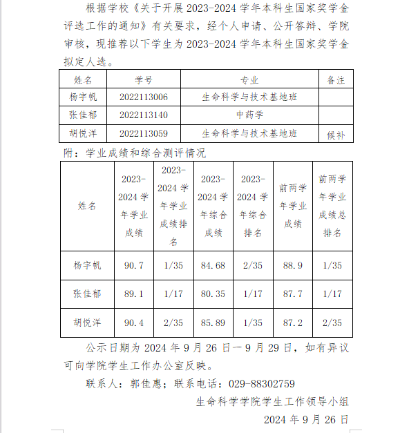 2026世界杯官网2023-2024学年本科生 国家奖学金拟推荐名单公示