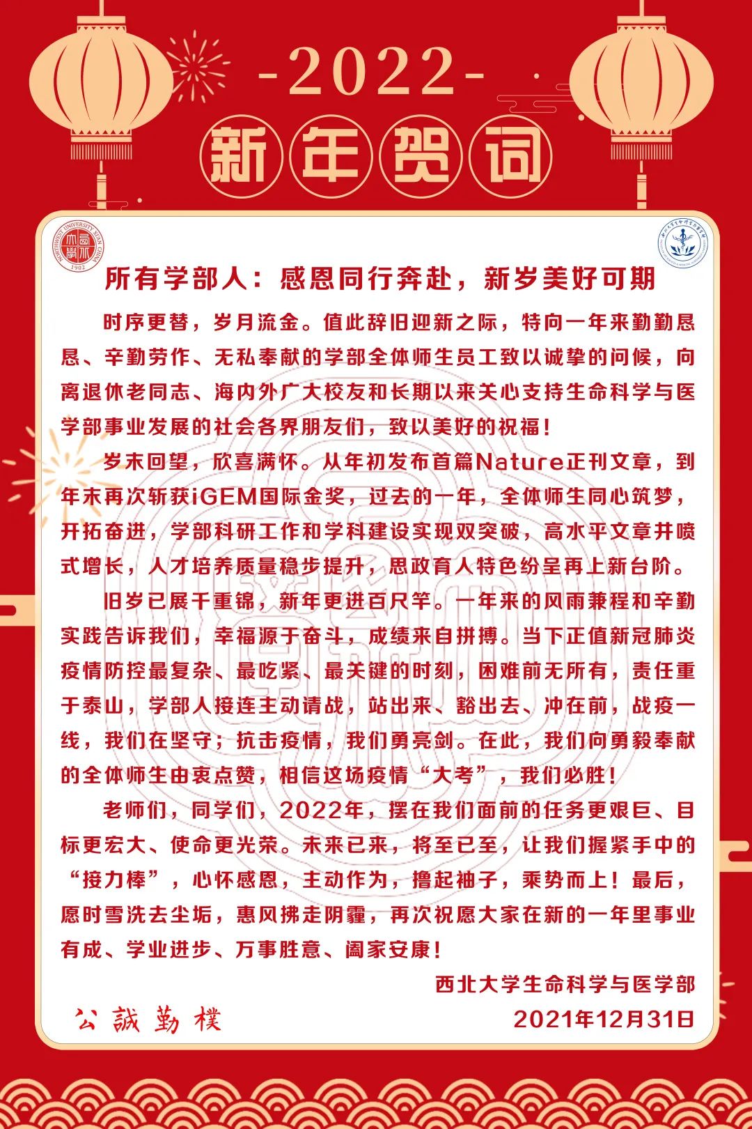 生命科学与医学部2022年新年贺词