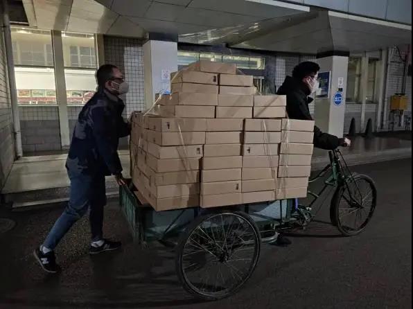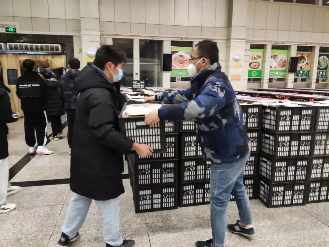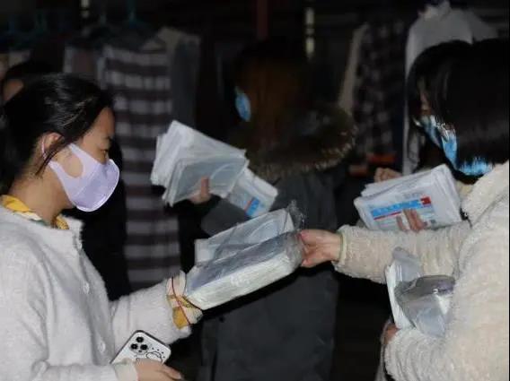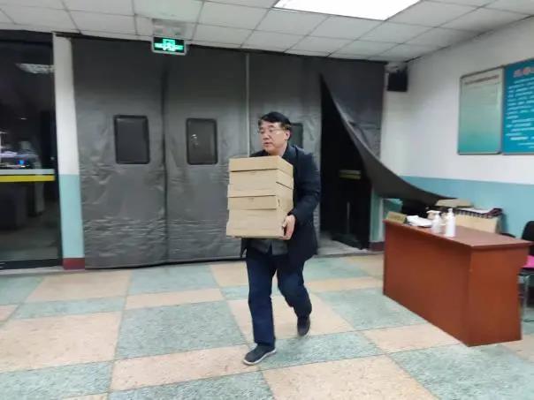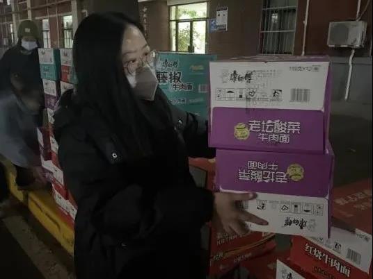 天色渐暗,老师们与时间赛跑,不顾严寒,忘却疲惫,争分夺秒为同学们卸载、分装、搬运物资,只盼望同学们能早些品尝到满当当的爱意,收获沉甸甸的幸福。