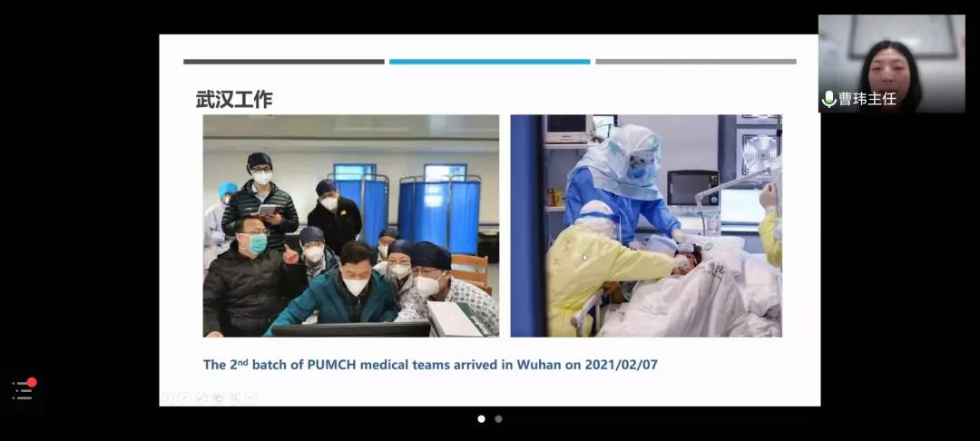 2020年2月7日至4月15日,作为北京协和医院援鄂医疗队专家代表,曹玮医生随国家援鄂抗疫医疗队奔赴武汉一线,参与了首批重症监护病房的建立、危重症患者救治等工作,并与武汉当地医院开展临床合作研究。她强调,广大师生一是要正确认识病毒,积极应对病毒;二是要做好自我防护,坚持科学防控;三是全体同学尤其是医员工一定要扎实学好专业知识,救死扶伤是医生的天职,也就是医生的使命与担当,期待西大学子能为未来的疫情阻击战做出“西大贡献”。