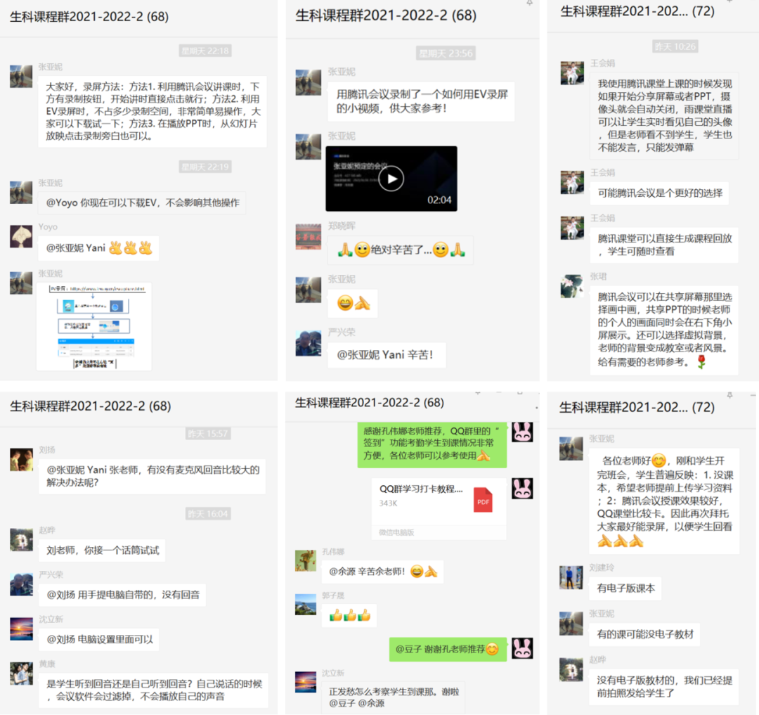 针对特殊时期线上教学特点,任课教师不断优化教学组织形式。针对平台拥堵现象启用多种备用方案,教师有效利用各网络教学平台功能,如利用腾讯会议、钉钉会议、QQ直播、QQ群课堂等方式组织教学活动;针对提前开课纸质教材还未到位的情况,教师第一时间将电子版、扫描版教材分享给员工,便于员工预习、复习;针对部分员工做核酸检测可能与上课时间冲突,教师授课同时开启在线课程录制,以备员工回看。