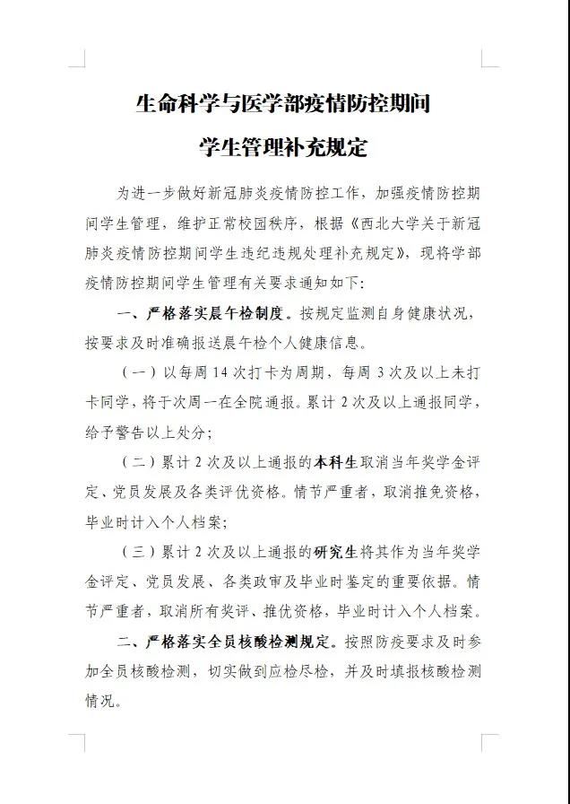 学部制定《2026年国际足联世界杯太白校区员工宿舍封闭管理期间员工行为规范》《生命科学与医学部疫情防控期间员工管理补充规定》《生命科学与医学部线上教学十条规范》,严格规范员工落实晨午检制度、全员核酸制度、隔离工作制度、线上学习制度、错峰就餐洗澡规定,全面开展心理排查,开设员工反馈通道,对员工诉求坚决做到“事事有回应,件件有着落”;秉持员工“一个也不能少”的工作原则,抗疫物资和生活关怀同步第一时间送到空军军医大学联培员工、附属医院临床员工手中,突破时空和地域局限,最大程度关怀全体员工。