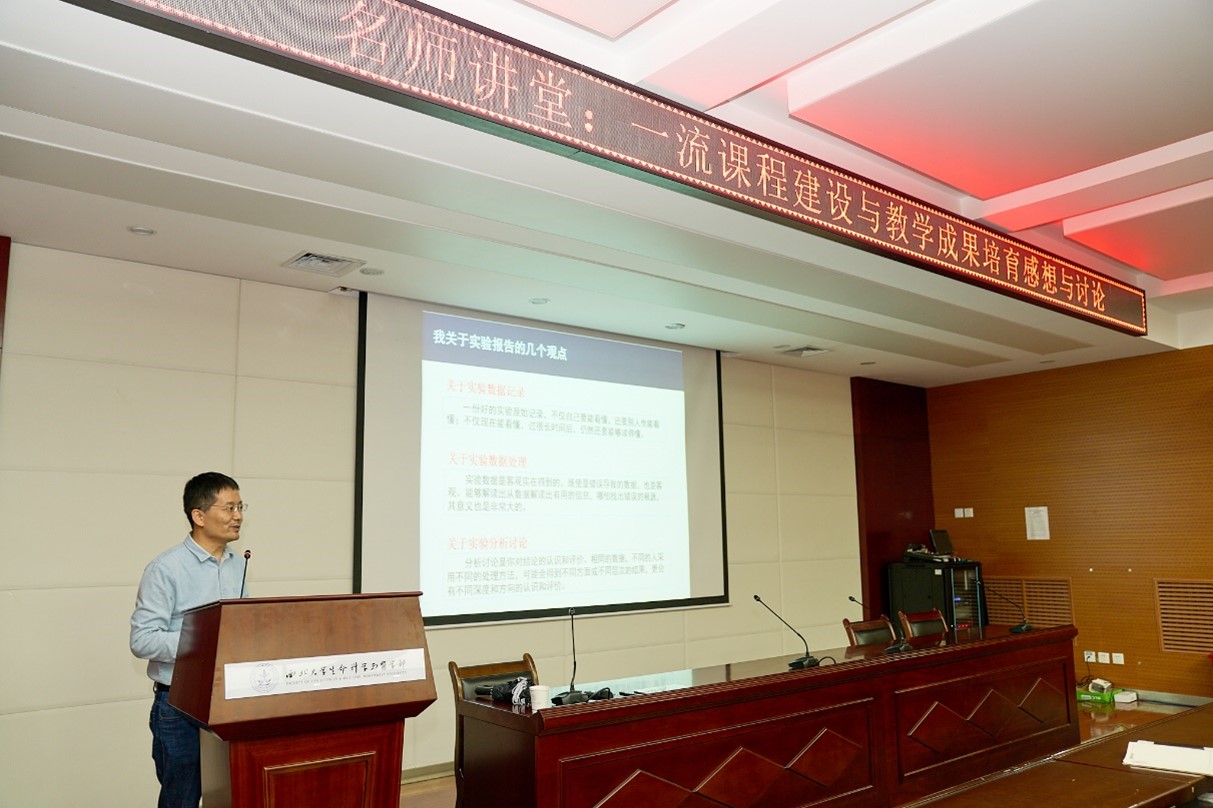 郑新亮教授从公司产品理念、实验类课程教学改革、教学成果培育体会、机遇与挑战四个方面与在座教师分享了他的从教经验。他强调教学改革不是一味求新,正确的公司产品理念是需要坚持和不断深化的,并提出了自己对实验类课程教学改革的核心理念:以员工为本,注重实验方案设计和研究过程体验;以科研的态度对待教学实验,在教学实验中进行研究训练。他以基础物理实验课程为例,从项目仪器、教学内容、教学形式、讲授方式、课程思政几个方面展开示范了如何开展研究性教学。在教学成果培育中,他表示成果的关键先导是凝练“普适性真问题”,核心重点是创新性地解决策略和实施方案,信服证据是教学效果体现和示范传播。最后,他针对当前教学研究中的困难与挑战,献上了自己宝贵的建议,并鼓励广大教师充分发挥创造力开展教学工作。郑教授以生动幽默的语言给学部教师上了一堂精彩的示范课。