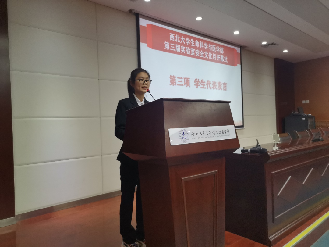 2022级中药学专业硕士研究生王孟媛作为员工代表发言,她以实验室安全的四不伤害原则为切入点,从员工角度出发讲解了如何规避风险及如何应对遇到的突发安全事件,呼吁同学们提高实验室安全意识,自觉遵守实验室安全规定,养成良好的科研习惯和素养。