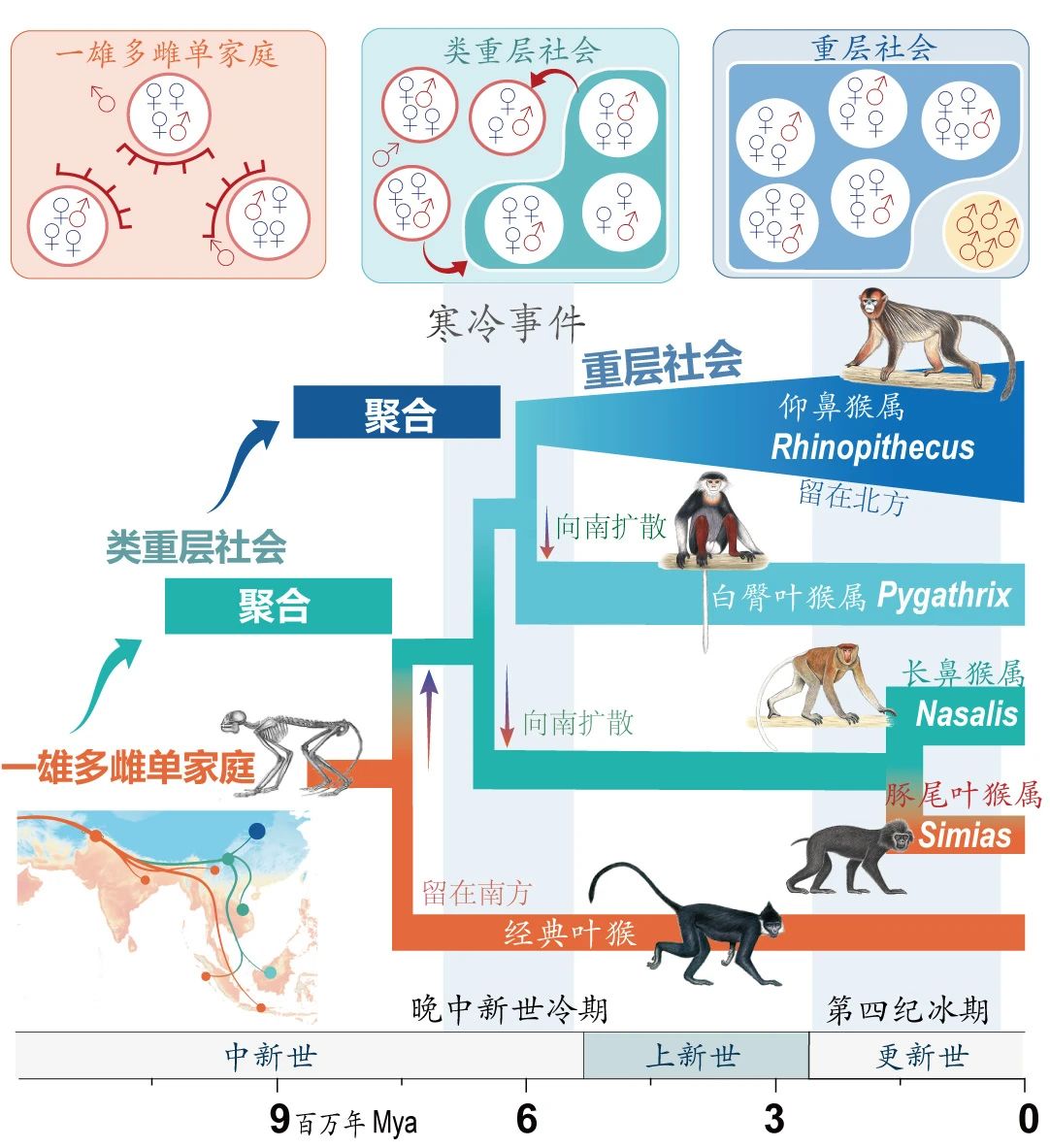 2026年国际足联世界杯齐晓光教授团队联合国内外多家科研单位,通过整合生态学、地质学、行为学、进化基因组学等多学科,通过系统发育分析和社会系统的祖先状态重建,发现亚洲叶猴中奇鼻猴类群的社会系统演化经历了两步式的聚合过程,且两次聚合都与冰期时期相关。在此过程中,与寒冷适应和神经激素相关的基因在奇鼻猴类群中发声变化,这些基因在社会联系中起着关键作用。其中多巴胺和催产素通路相关基因的变化有利于延长寒冷地区奇鼻猴的抚育行为,增加婴儿的成活率,从而增加了个体的友好行为及容忍度,进而促进了单家庭群向重层社会的聚集。