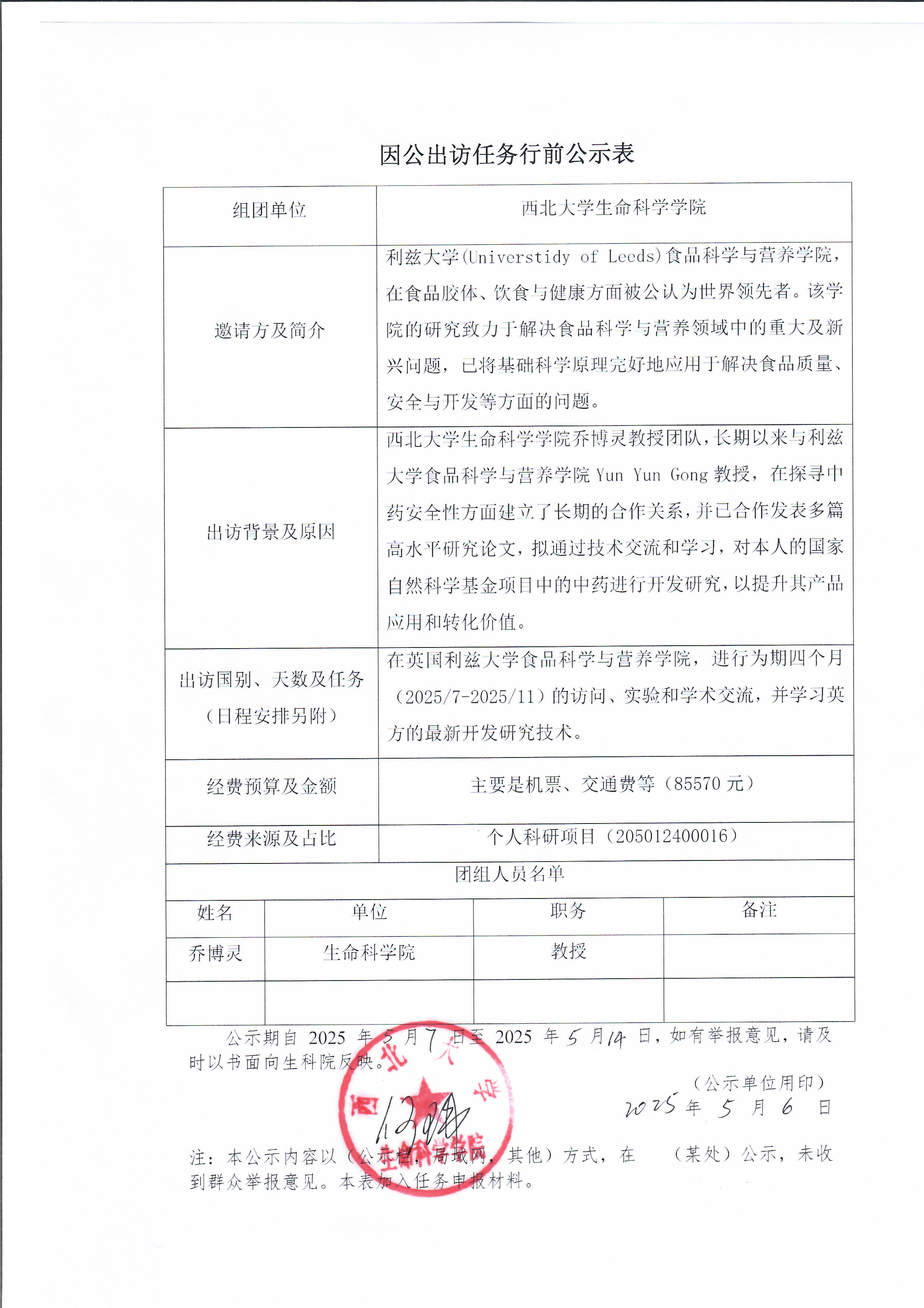 因公出访任务行前公示表