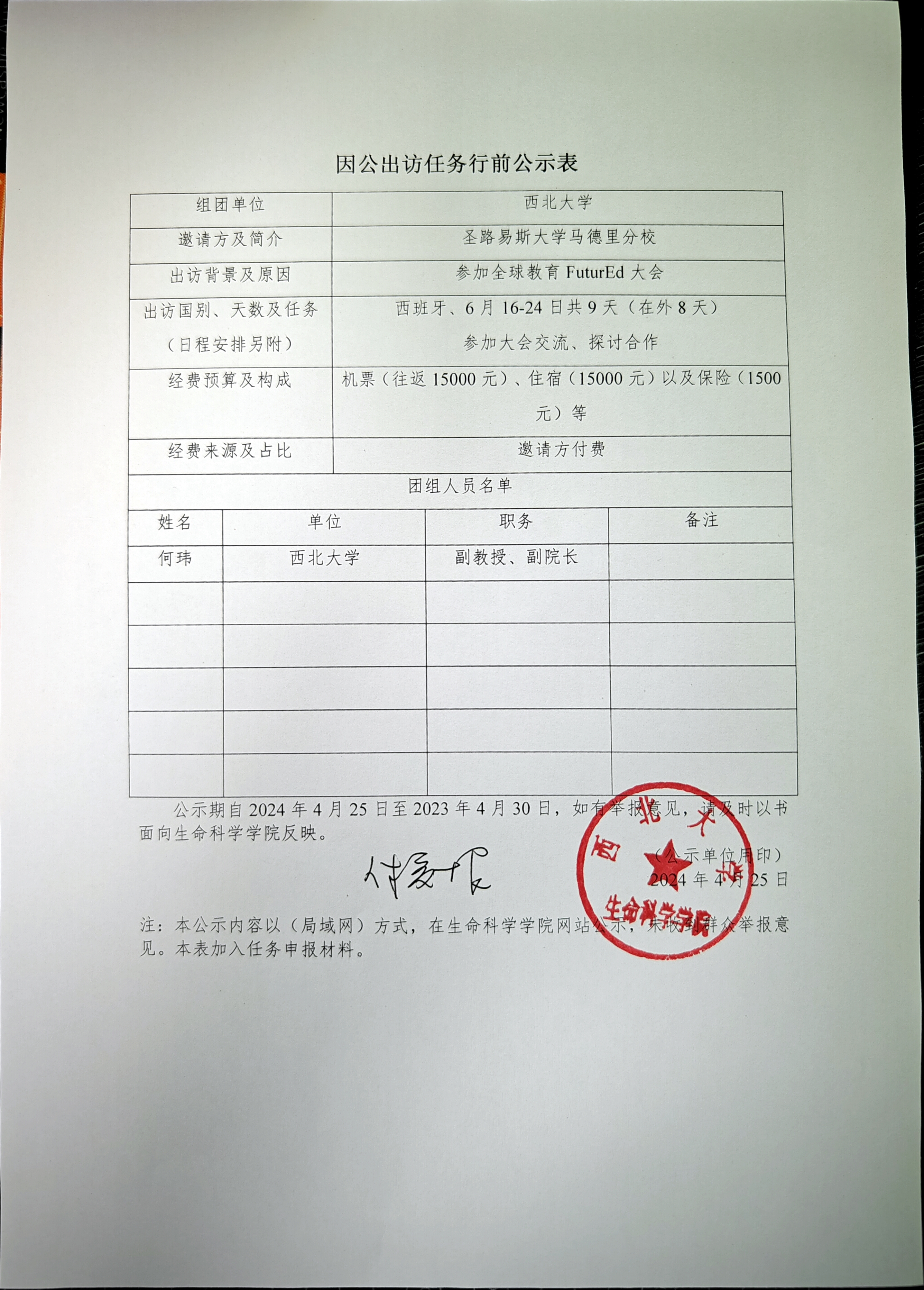 因公出访任务行前公示表