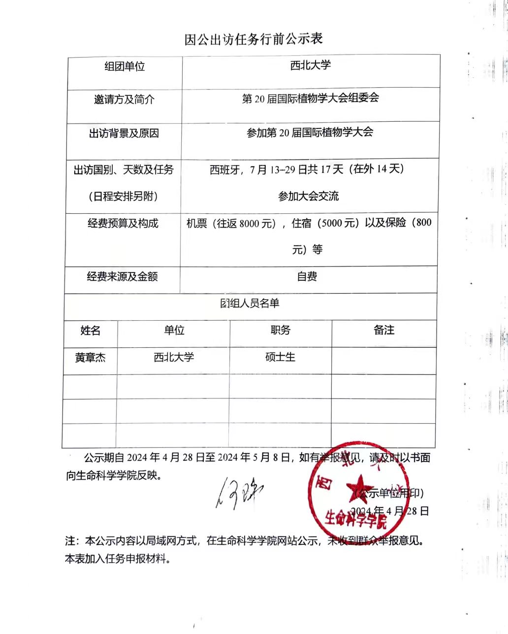 因公出访任务行前公示表