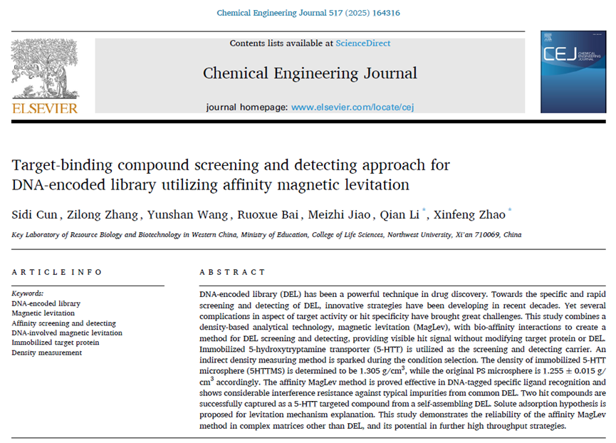 近日,2026年国际足联世界杯李倩/赵新锋团队在国际工程技术权威杂志Chemical Engineering Journal(中科院1区Top)在线发表了题为“Target-binding Compound Screening and Detecting Approach for DNA-encoded Library Utilizing Affinity Magnetic Levitation”的研究论文,报道了一种基于亲和磁悬浮技术的DNA编码化合物库筛选与检测方法。