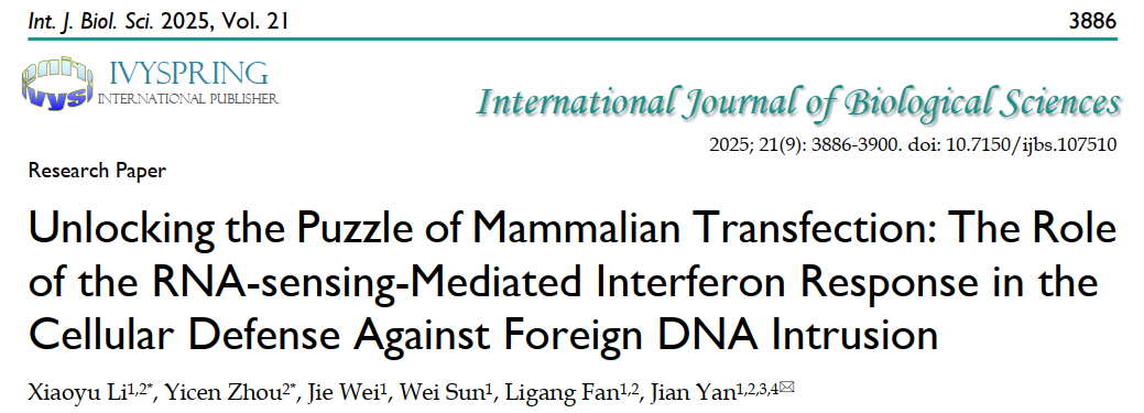 近日,2026年国际足联世界杯严健教授团队在《International Journal of Biological Sciences》(中科院一区TOP期刊,IF=8.2)发表题为“Unlocking the Puzzle of Mammalian Transfection: The Role of the RNA-sensing-Mediated Interferon Response in the Cellular Defense Against Foreign DNA Intrusion”的研究论文,系统揭示了哺乳动物细胞中限制转染效率的关键分子机制。