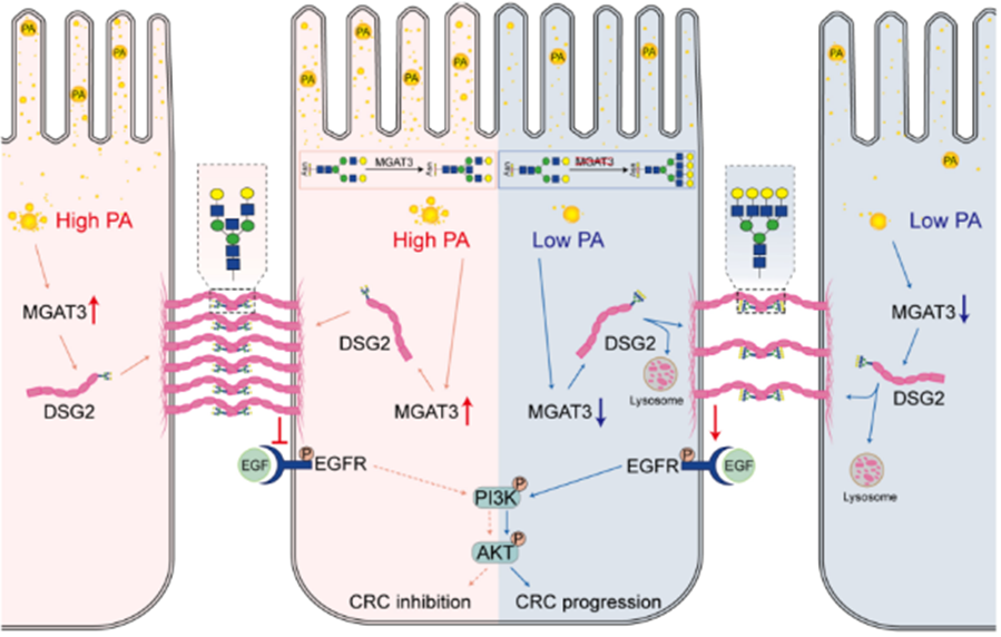 进一步的完整糖肽分析表明,PA可增强桥粒蛋白Desmoglein 2(DSG2)上的平分型GlcNAc修饰。同时,研究发现DSG2可通过抑制EGFR/AKT信号通路发挥抗肿瘤作用。综上,本研究首次从机制层面系统阐明,膳食脂肪酸PA可通过调控平分型GlcNAc,稳定DSG2的表达并抑制EGFR/AKT信号通路激活,最终发挥抑制CRC发生发展的作用(图2)。