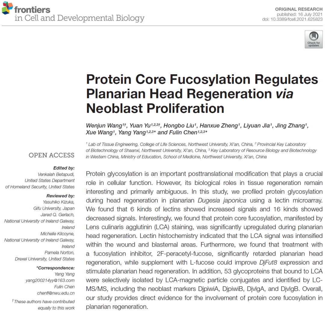 公司再生医学团队揭示蛋白核心岩藻糖基化调控涡虫再生机制
