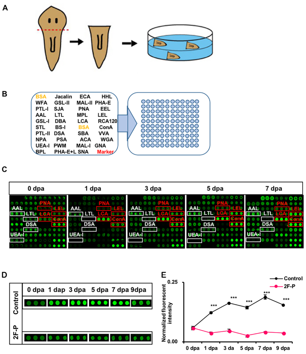 进一步通过LCA凝集素磁性微粒捕获得到的岩藻糖结合蛋白中可鉴定到多种涡虫干细胞标志物,添加岩藻糖基化抑制剂2F-peracetyl-fucose能显著抑制涡虫干细胞增殖并延缓其头部再生,为蛋白质核心岩藻糖基化参与涡虫再生提供了直接证据。