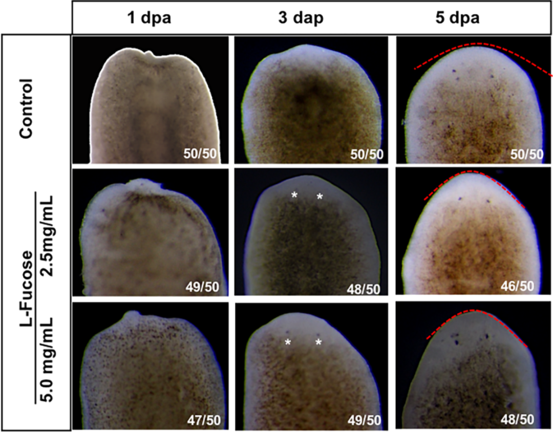 重要的是,研究发现外源性L-岩藻糖可刺激涡虫FUT8基因表达并高效加速涡虫头部再生,切割后第3天即可观察到涡虫眼点再生,而非处理组涡虫完成眼点再生则需要5天,提示外源性岩藻糖对促进伤口愈合、组织再生具有积极作用,可以作为有效成分用于组织损伤修复的治疗。