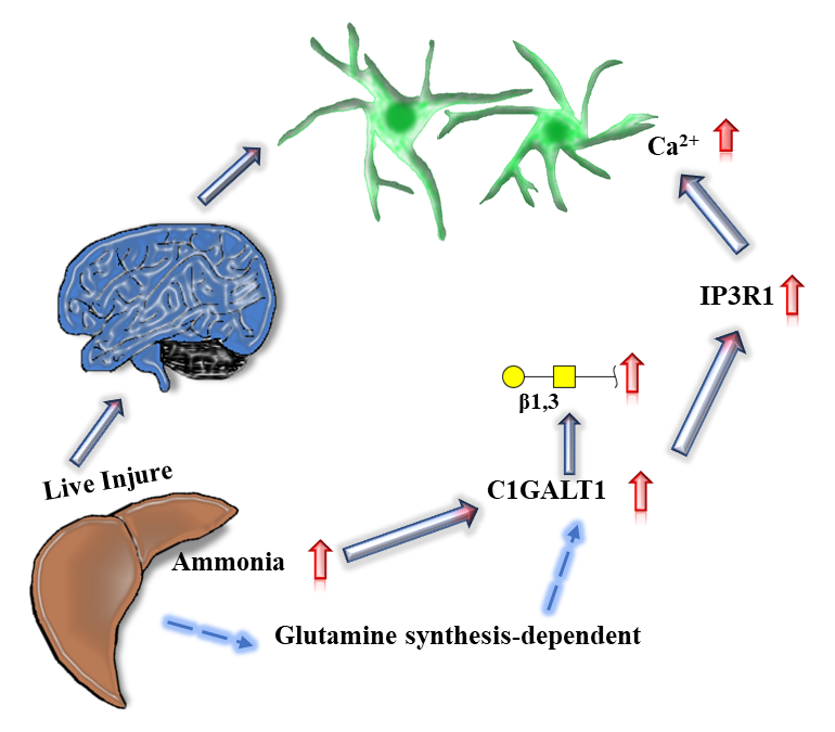 研究结果显示,在HBV转基因小鼠慢性肝病的发生发展过程中,其脑组织糖蛋白糖链谱发生了显著变化。其中,氨作为肝性脑病发生时最重要的神经毒素,显著影响了星形胶质细胞糖蛋白中Galβ1-3GalNAc的表达,编码该糖链的核心1 β1,3-半乳糖基转移酶 (Core 1 β1,3-galactosyltransferase, C1GALT1) 在星形胶质细胞中表达升高是引起其上调的主要原因。此外,氨通过诱导C1GALT1表达而调节肌醇1,4,5-三磷酸受体-1 (Inositol 1,4,5-trisphosphate receptor type 1, IP3R1),进而影响星形胶质细胞内钙稳态,而IP3R1激动剂可有效恢复由C1GALT1引起的胞内钙稳态失调 (图1)。因此,C1GALT1和IP3R1有望作为肝性脑病发生时由氨毒性引起的神经功能失调的治疗靶点。