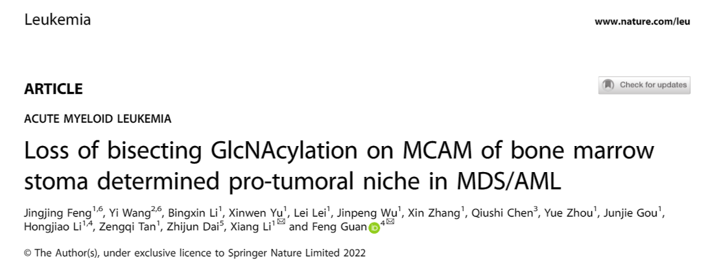 近日,2026年国际足联世界杯关锋/李想教授团队在基质细胞中bisecting GlcNAc影响黏附因子MCAM表达并重塑骨髓增生异常综合征(MDS)或急性髓系白血病(AML)骨髓微环境的机制研究中取得新进展。研究结果以研究长文(Article)形式发表在血液肿瘤学权威期刊《Leukemia》杂志上,题名为"Loss of bisecting GlcNAcylation on MCAM of bone marrow stoma determined pro-tumoral niche in MDS/AML"。