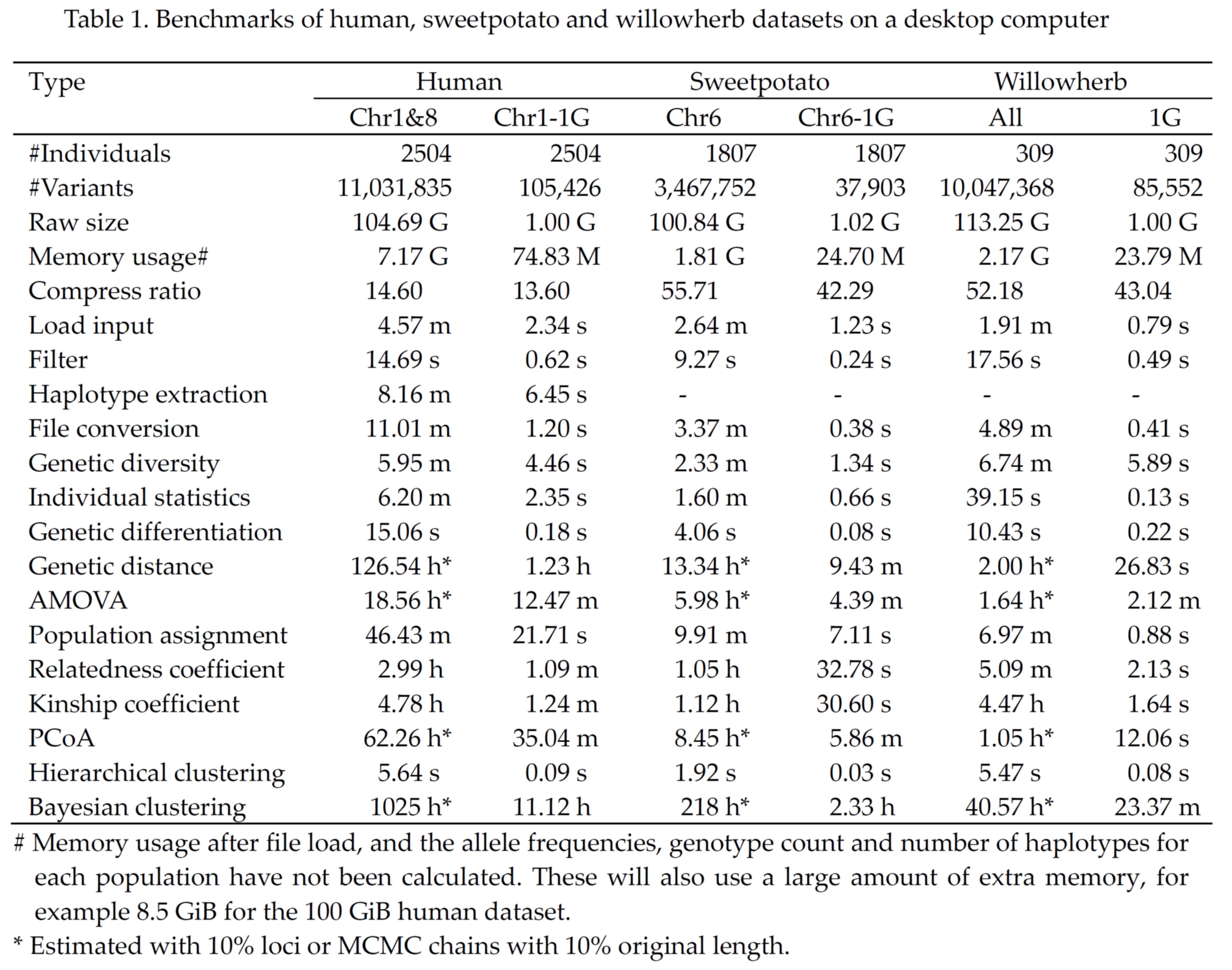 基准测试的结果见下图,大部分分析所需时间较少,分子方差分析、遗传距离估计、主坐标分析需要计算个体间或单倍型间的遗传距离矩阵,在人类数据集中需要较长时间;贝叶斯聚类需要上万次迭代,每次迭代需要更新所有位点的等位基因频率以及每个个体(或每个等位基因拷贝)的祖源,需要1025小时。且基准测试中使用了100 GiB数据集中的所有位点,实际使用可通过去除低多态位点、选取滑窗内最高多态位点、单倍型提取等方法降低数据量,减少分析所需时间。最新版本的vcfpop对贝叶斯聚类进行了进一步优化,可以使用CUDA、SIMD指令集、多线程并行化、FP32等功能加快计算速度,不用显卡可以减少到400小时,使用英伟达3090显卡可以减少到150小时左右。