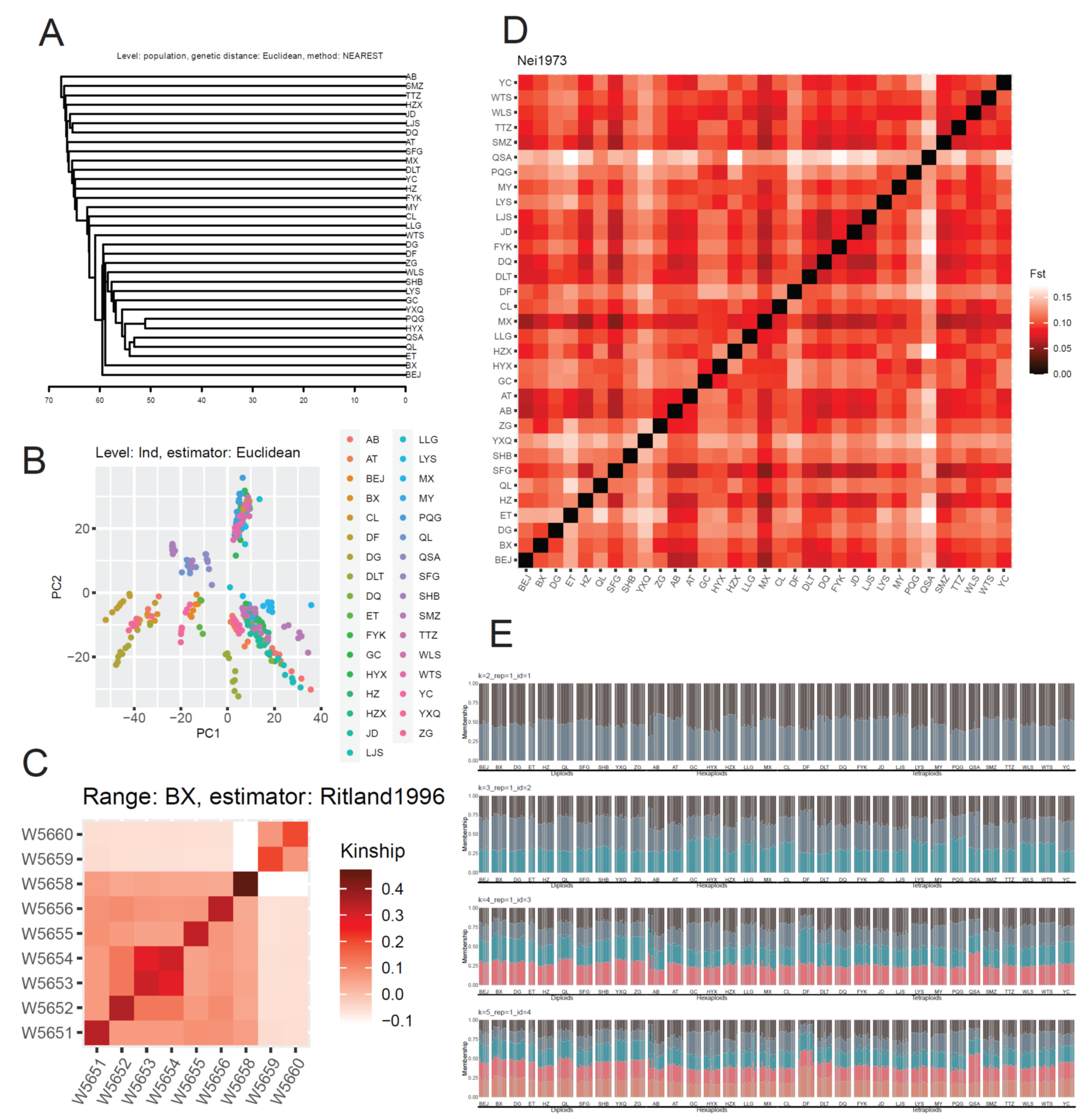 部分分析结果可以通过-func_plot=yes参数进行可视化(需要安装R和若干R包),其中热图用于遗传分化、遗传距离、亲缘关系和亲缘关系系数的可视化;树状图用于等级聚类的可视化;条形图用于贝叶斯聚类的可视化;散点图用于主坐标分析的可视化,如下图所示。
