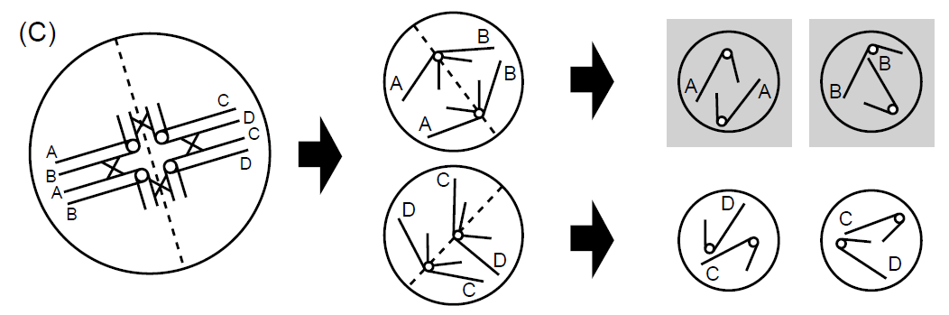 双减数示意图,左中右的圆圈分别为初级性母细胞、次级性母细胞以及配子,灰色背景的配子发生双减数,来源 (Huang et al. 2019 G3)