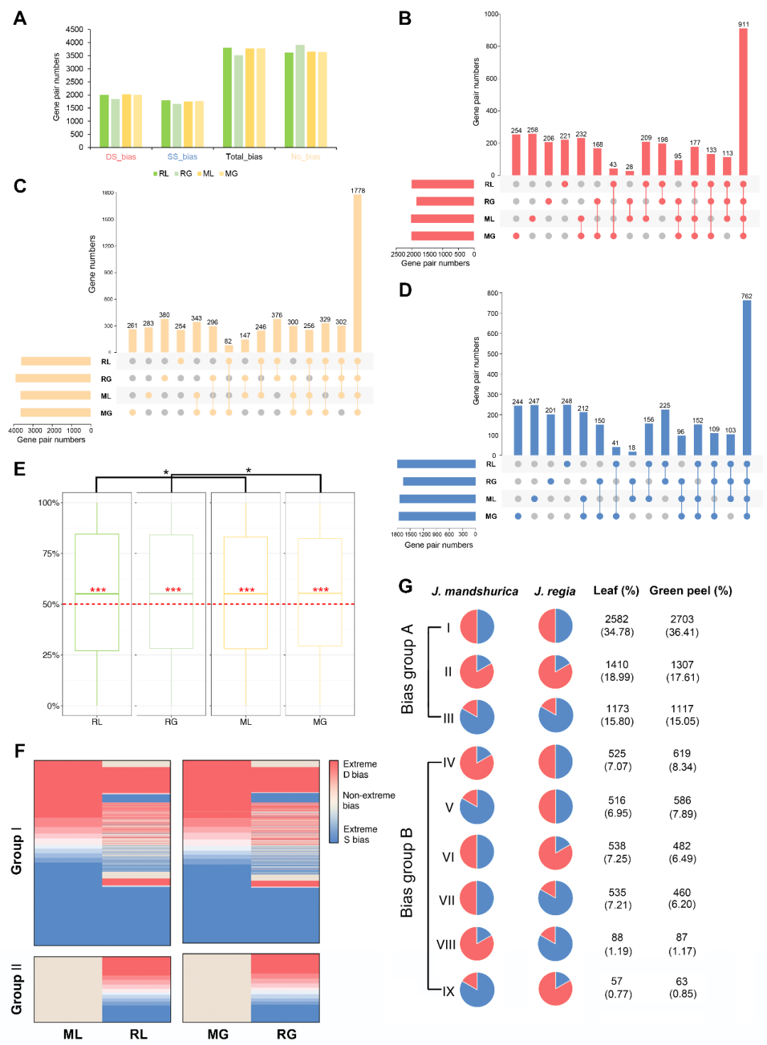 研究确认了核桃与核桃楸叶片、青果皮中存在亚基因组表达优势现象,并发现偏向表达基因(biased expression genes, BEGs)主要与外界刺激响应有关,而非BEGs则可能与一些信号转导相关复合物的组成有关。