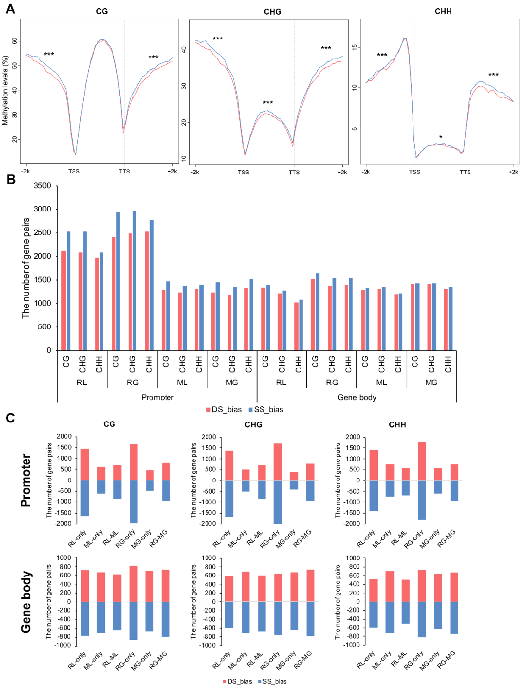 图4 核桃和核桃楸亚基因组上不对称的DNA甲基化修饰特征