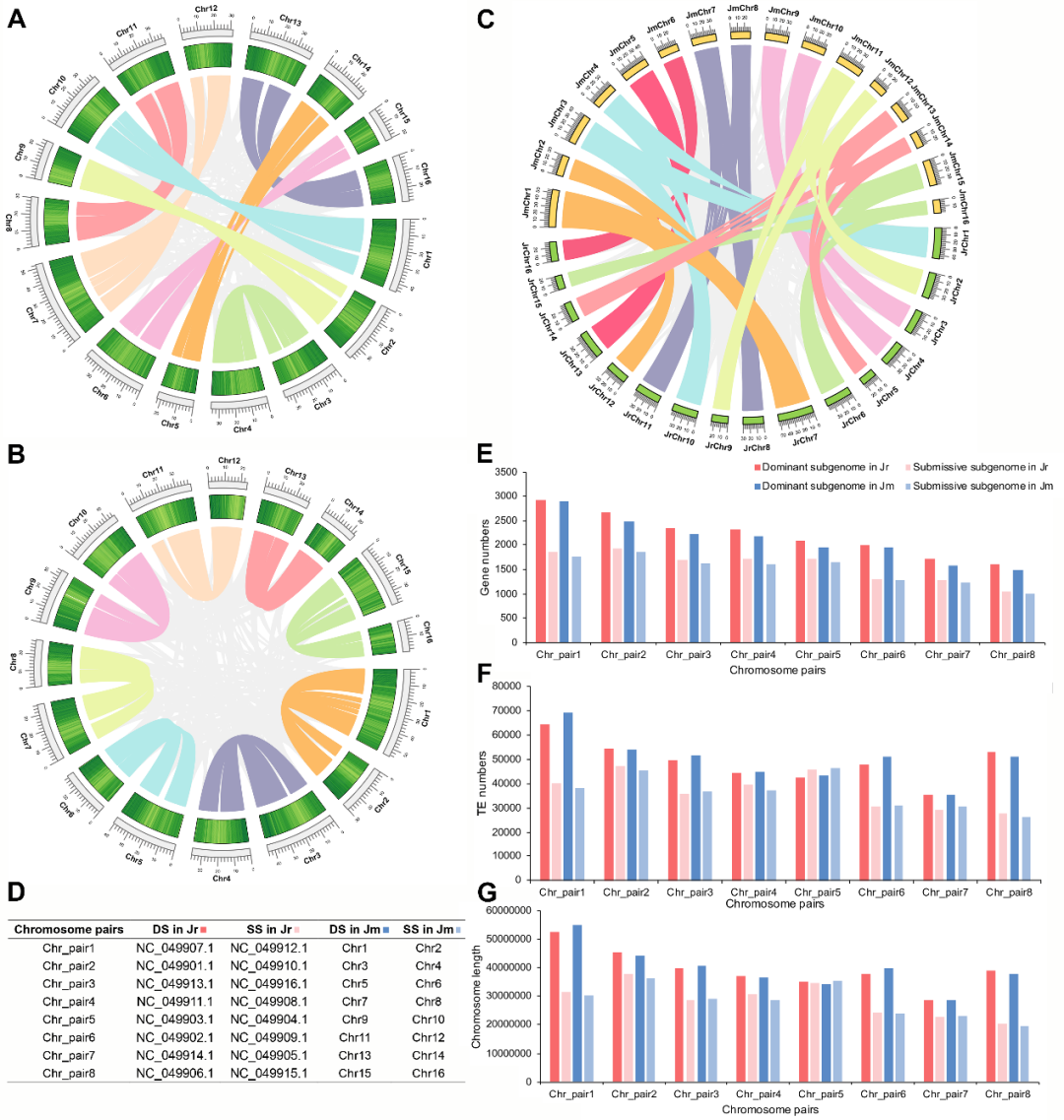 该研究以核桃和核桃楸的叶片和青果皮为材料,利用高通量测序技术,明确了胡桃属两个物种亚基因组表达优势的特征,并探讨了其表观遗传基础。通过共线性分析,将两个物种的基因组划分为显性亚基因组(dominant subgenome, DS)和随从亚基因组(submissive subgenome, SS, 图2),功能富集分析显示DS特有基因可能在生物应激反应、病原体防御中起着关键作用,另外,偏向表达基因(biased expression genes, BEGs)主要与外界刺激响应有关,而非BEGs则可能与一些信号转导相关复合物的组成有关。