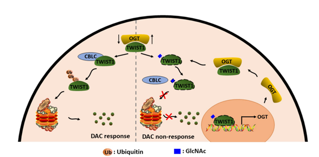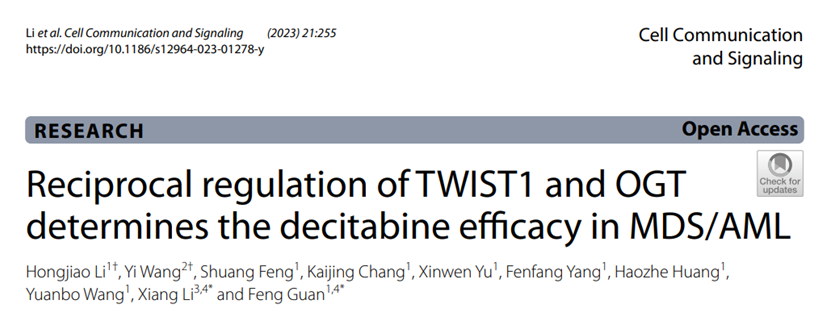 另一方面,该研究从蛋白质翻译后修饰的角度阐述了TWIST1在MDS中表达异常升高的机制,发现转录因子TWIST1蛋白上的31位丝氨酸上存在O-GlcNAc修饰,并且该修饰可以抑制TWIST1与E3泛素连接酶CBLC的互作,进而抑制TWIST1发生泛素化修饰,稳定TWIST1的表达,通过染色质共沉淀和双荧光素酶报告基因实验,发现TWIST1可以结合OGT启动子区,激活OGT转录。该研究成果以“Reciprocal regulation of TWIST1 and OGT determines the decitabine efficacy in MDS/AML”为题发表在Cell Communication and Signaling期刊,西北老员工科院博士后李鸿姣和陕西省人民医院血液科王一主任为共同第一作者,李想教授和关锋教授为共同通讯作者。