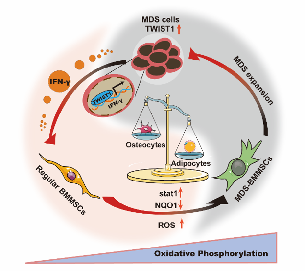 该研究发现MDS/AML恶性克隆细胞能够促进BMMSCs的成脂分化、抑制成骨分化,从而促进MDS克隆细胞的扩增。本文通过临床样本,利用细胞模型和小鼠模型发现MDS/AML细胞中高表达的转录因子TWIST1在介导BMMSCs分化重编程中起着至关重要的作用。TWIST1可诱导MDS/AML细胞分泌更多IFN-γ,而IFN-γ可通过激活Stat1信号通路抑制活性氧清除剂NQO1的表达,增高BMMSCs中活性氧含量,最终导致BMMSCs成脂分化能力增强,成骨分化能力减弱。使用Stat1信号通路抑制剂fludarbine和活性氧清除剂NAC可以逆转由MDS克隆细胞导致的BMMSCs的分化重编程,抑制促癌骨髓微环境的形成。此研究详细阐述了MDS克隆细胞中TWIST1影响BMMSCs分化重编程的机制,将为后续通过靶向恶性克隆细胞中的驱动癌基因,如TWIST1,重塑周围骨髓微环境,为治疗MDS/AML和其他造血恶性肿瘤提供新的治疗策略。该研究成果以 “Clonal MDS/AML cells with enhanced TWIST1 expression reprogram the differentiation of bone marrow MSCs”为题发表在Redox Biology期刊,西北老员工科院博士后李鸿姣和陕西省人民医院血液科王一主任为共同第一作者,李想教授为通讯作者。