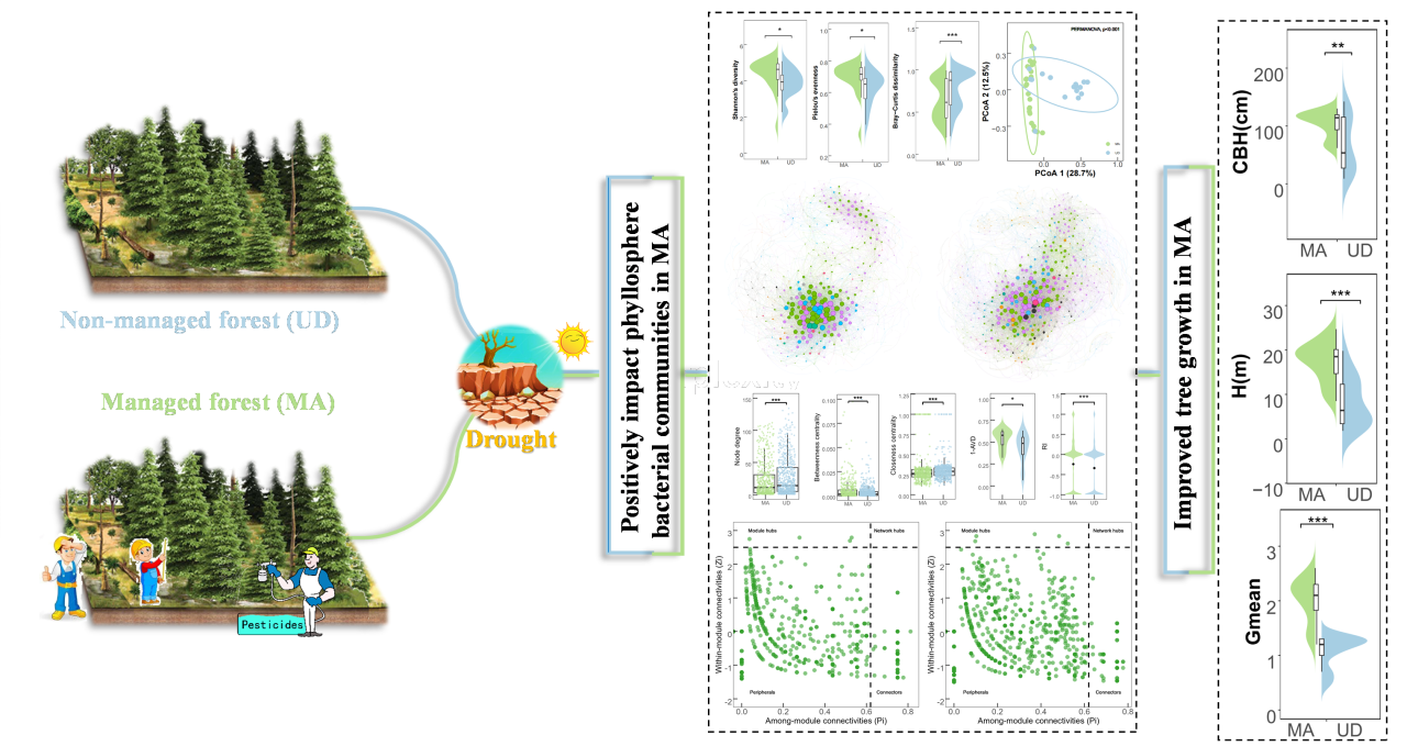 森林管理对青海云杉叶际微生物群落产生正向影响。结果表明:经管理的森林,叶际微生物群落α-多样性增加,β-多样性降低;其次,在管理下,叶际微生物群落稳定性增加,抵抗力更强。此外,森林管理改变了叶际微生物群落的关键物种和构建过程,增强了确定性过程的作用,减弱了随机过程的作用。我们的研究结果支持这样的假设,即森林管理可以重塑叶际微生物群落,增强群落稳定性,最终促进树木生长。反过来,叶际微生物与植物之间的密切相互作用决定了植物对环境变化的反应,并形成了共同进化和互惠共生的反馈回路。