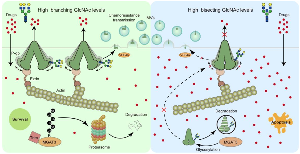平分型GlcNAc修饰是一种特殊的N-糖基化修饰,在糖转移酶MGAT3的催化下,将GlcNAc以β-1,4糖苷键连接在五糖核心中的甘露糖上所形成。平分型GlcNAc修饰能够调控N-糖链的延伸及末端修饰,从而影响蛋白质的生物学功能。该研究发现,乳腺癌耐药患者中平分型GlcNAc修饰显著降低;提高平分型GlcNAc水平显著抑制乳腺癌的耐药过程;糖肽质谱检测发现,P-gp的Asn494位点具有平分型GlcNAc修饰,该修饰通过抑制Ezrin蛋白与P-gp蛋白的相互作用进而降低P-gp的膜定位及耐药能力;分子动力学模拟发现,P-gp的Asn494位点的平分型GlcNAc结构不利于药物外排过程中P-gp构象的变化;此外,平分型GlcNAc修饰还能够通过抑制VPS4A与P-gp的互作降低微囊泡中P-gp的含量并抑制微囊泡介导的耐药性传递过程。该研究阐明了平分型GlcNAc对药泵蛋白功能及乳腺癌耐药的重要作用,也为攻克肿瘤耐药提供了新思路。