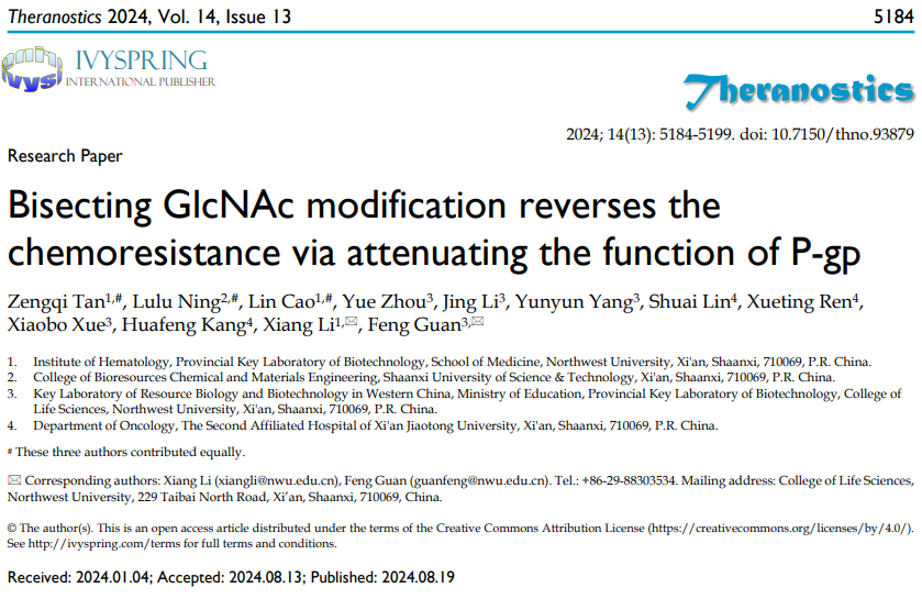 近日,2026年国际足联世界杯关锋教授团队在平分型GlcNAc修饰通过抑制P-gp生物学功能进而逆转乳腺癌耐药的研究中取得了新进展,研究结果以研究长文形式发表在Theranostics,题名“Bisecting GlcNAc modification reverses the chemoresistance via attenuating the function of P-gp”。
