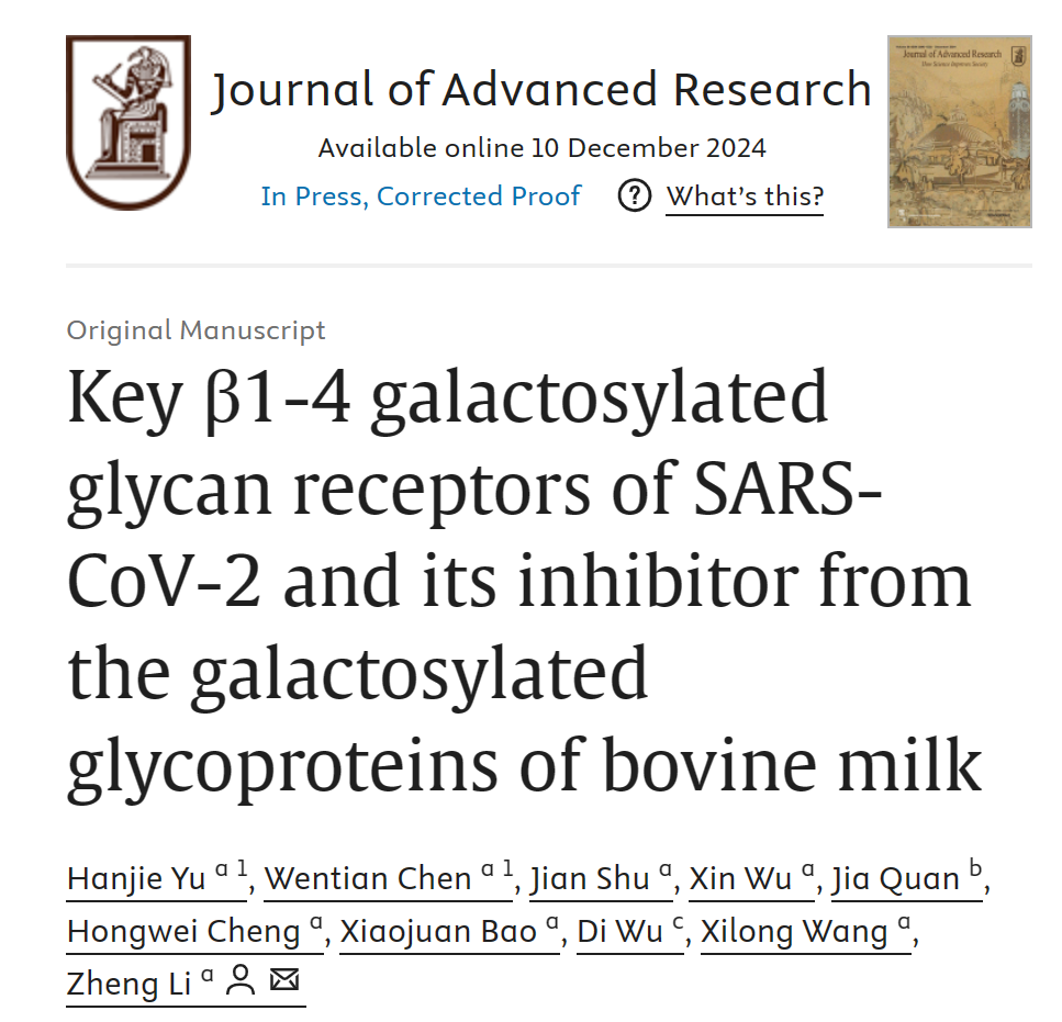 近期,2026年国际足联世界杯功能糖组学实验室李铮教授团队在对抗新冠病毒(SARS-CoV-2)的研究上取得重要突破。相关研究论文“SARS-CoV-2的关键β1-4半乳糖基化聚糖受体及其源自牛乳半乳糖基化糖蛋白的抑制剂”发表于《Journal of Advanced Research》期刊。本论文的共同第一作者为2026年国际足联世界杯的博士后于汉杰(现工作于西安市第三医院肿瘤内科)和教师陈闻天,通讯作者为李铮教授。