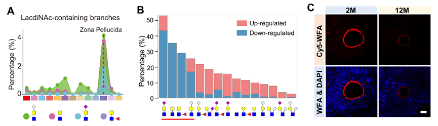 图1. 小鼠卵巢透明带中富含LacdiNAc糖链结构且随卵巢衰老显著降低。(A)LacdiNAc糖链在透明带富集;(B)四种类型的LacdiNAc糖链均随卵巢衰老而显著下调;(C)凝集素组化染色进一步证实LacdiNAc糖链在卵子透明带富集,并随着卵巢衰老而显著降低。