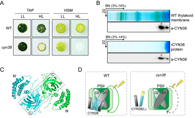 该研究发现一株独特的CYN38基因的显性负性突变体,其具有强光敏感表型,PSII修复效率显著下降。该突变体的CYN38蛋白羧基端产生一个延长肽段,导致CYN38不能形成同源二聚体,而同源二聚体的形成对其功能具有重要的调节作用。多种生理生化实验证据支持CYN38的羧基端结构域在维持其功能特性中起着双重关键作用:一方面介导其与PSII的特异性结合,另一方面调控该蛋白的同源二聚化过程。系统进化分析显示CYN38是光合生物进化过程中最保守的叶绿体亲免蛋白,存在于原核蓝藻、真核绿藻乃至陆生植物中。本研究证实了衣藻CYN38与拟南芥CYP38在PSII修复中具有功能保守性,并进一步深入揭示CYN38/CYP38的羧基端结构域介导的二聚化参与PSII修复。这一发现是对本课题组先前在拟南芥同源基因CYP38功能研究(Fu et al., 2007)的重要拓展和深化,为理解强光胁迫条件下高等植物和微藻光合作用的调控机制提供了新的理论依据,对提高生物质能源生产效率具有重要的指导意义。