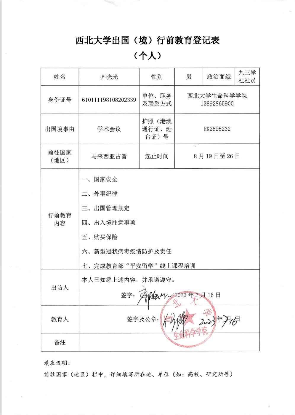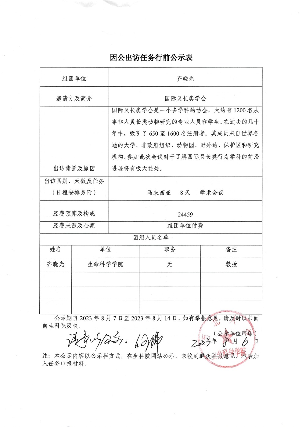 因公出访任务行前公示表