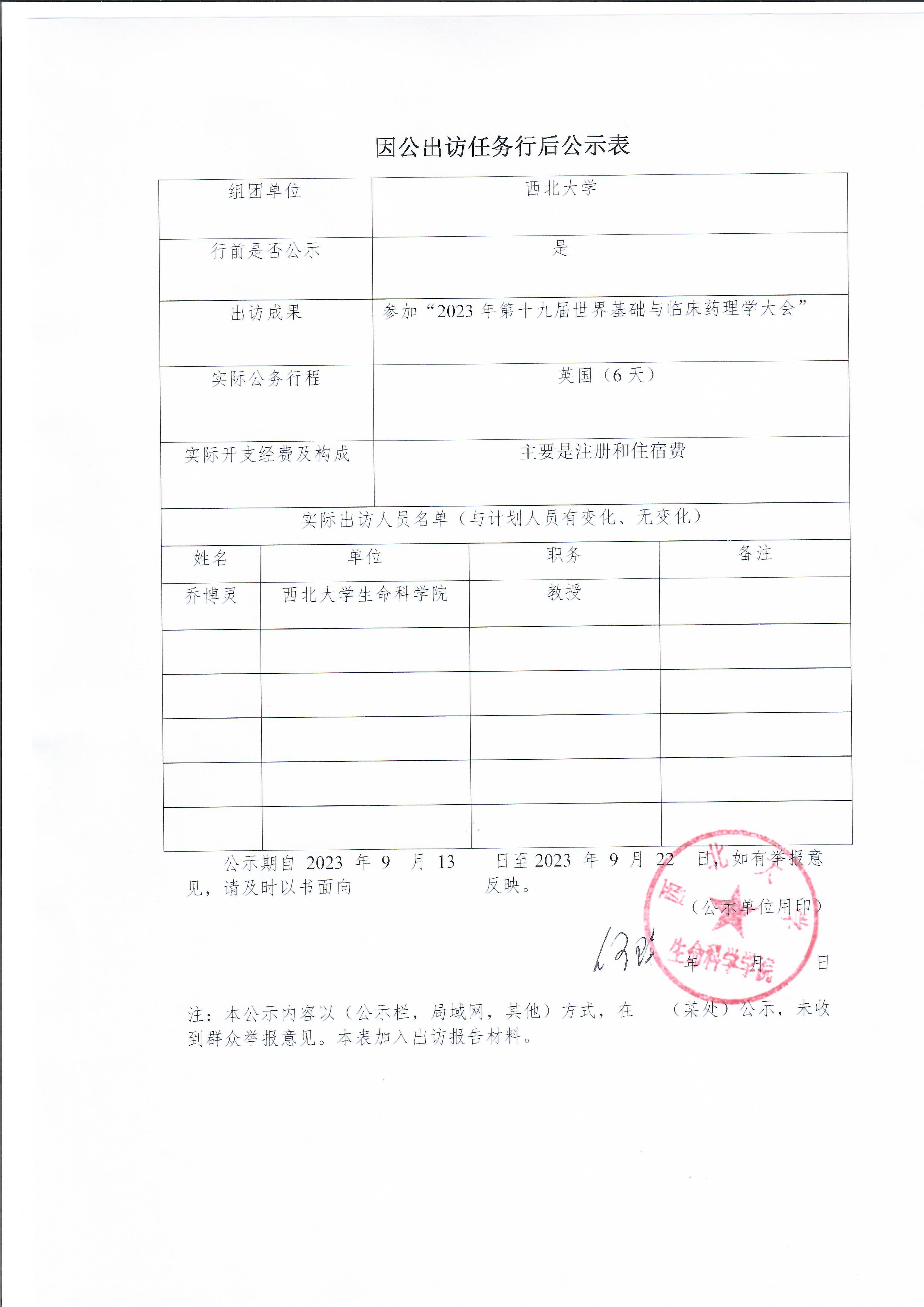 因公出访任务行后公示表