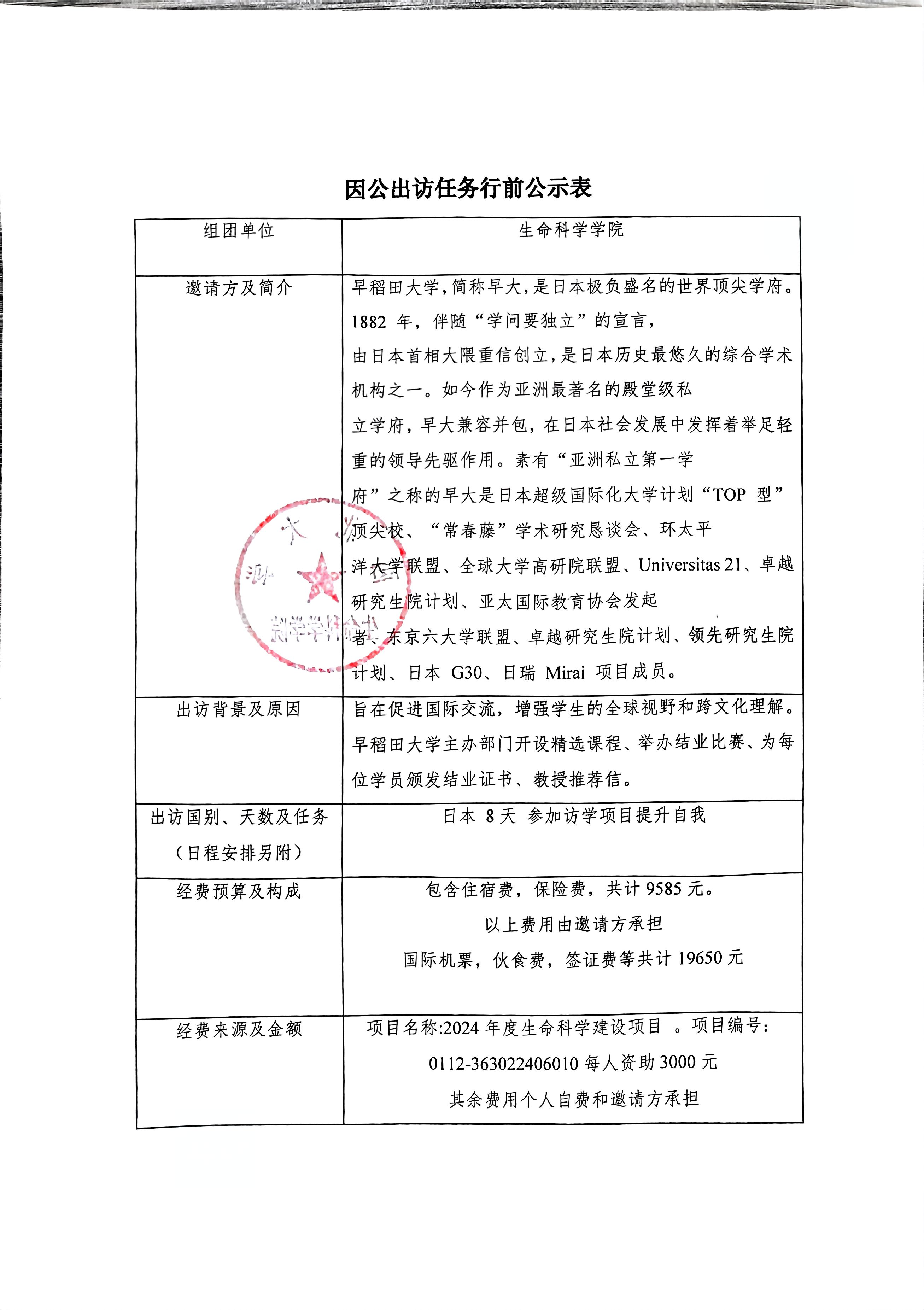 因公出访任务行前公示表